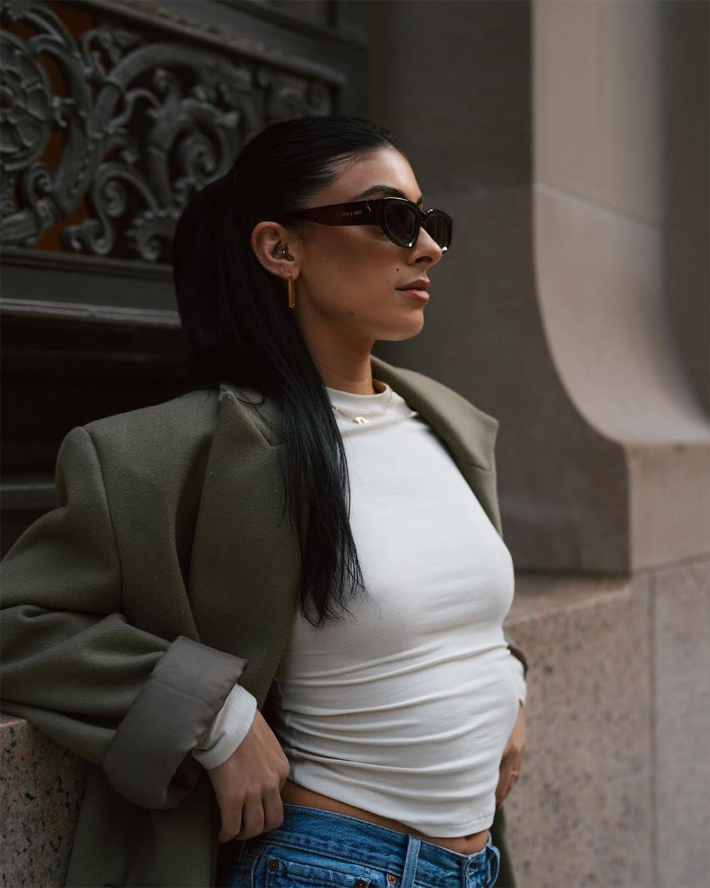 Malia polarized sunglasses command attention with their oversized square frame and sculpted silhouette. Featuring a single gold bar inset at the temples, this design delivers bold structure with a luxe touch.