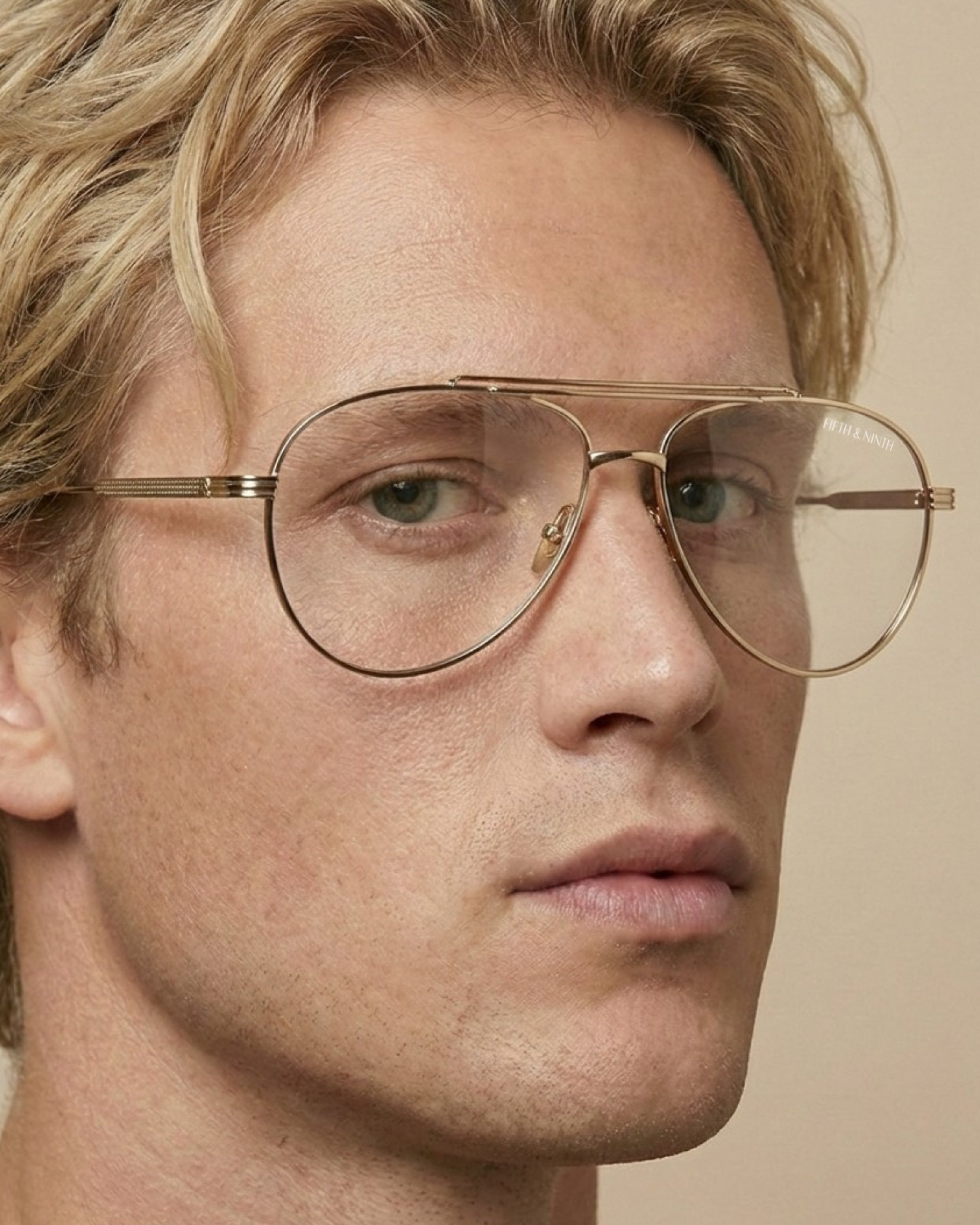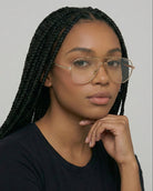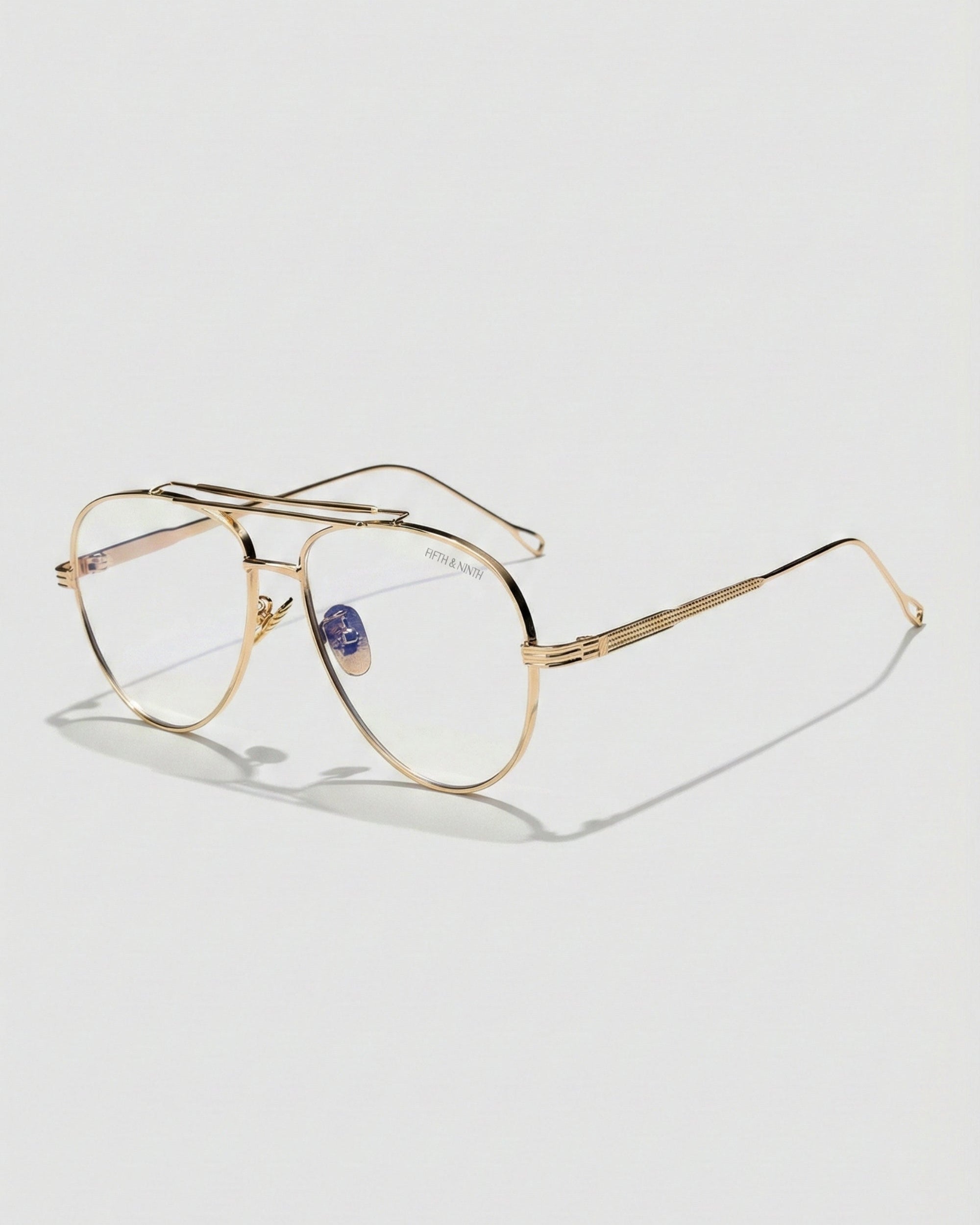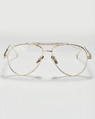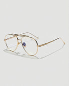 Spencer blue light glasses blend modern elegance with subtle details for a refined everyday look. Featuring a gold metal aviator-style frame with a sleek double bridge and metal nose pads, these unisex glasses stand out with finely engraved temple detailing. The open-shaped ear tips and distinctive accents add a fresh take on classic eyewear.