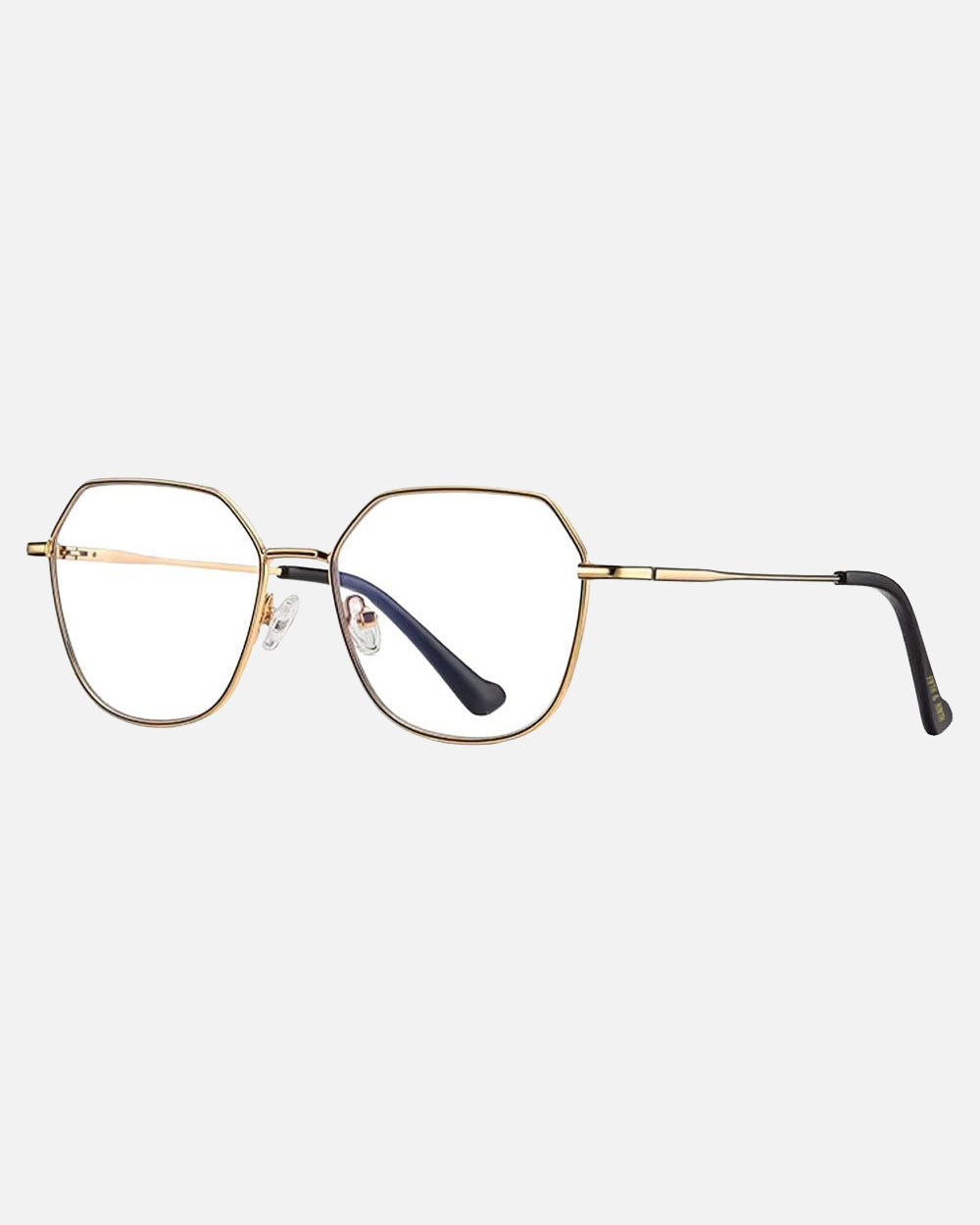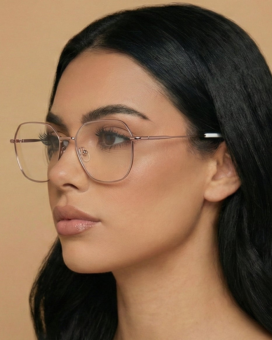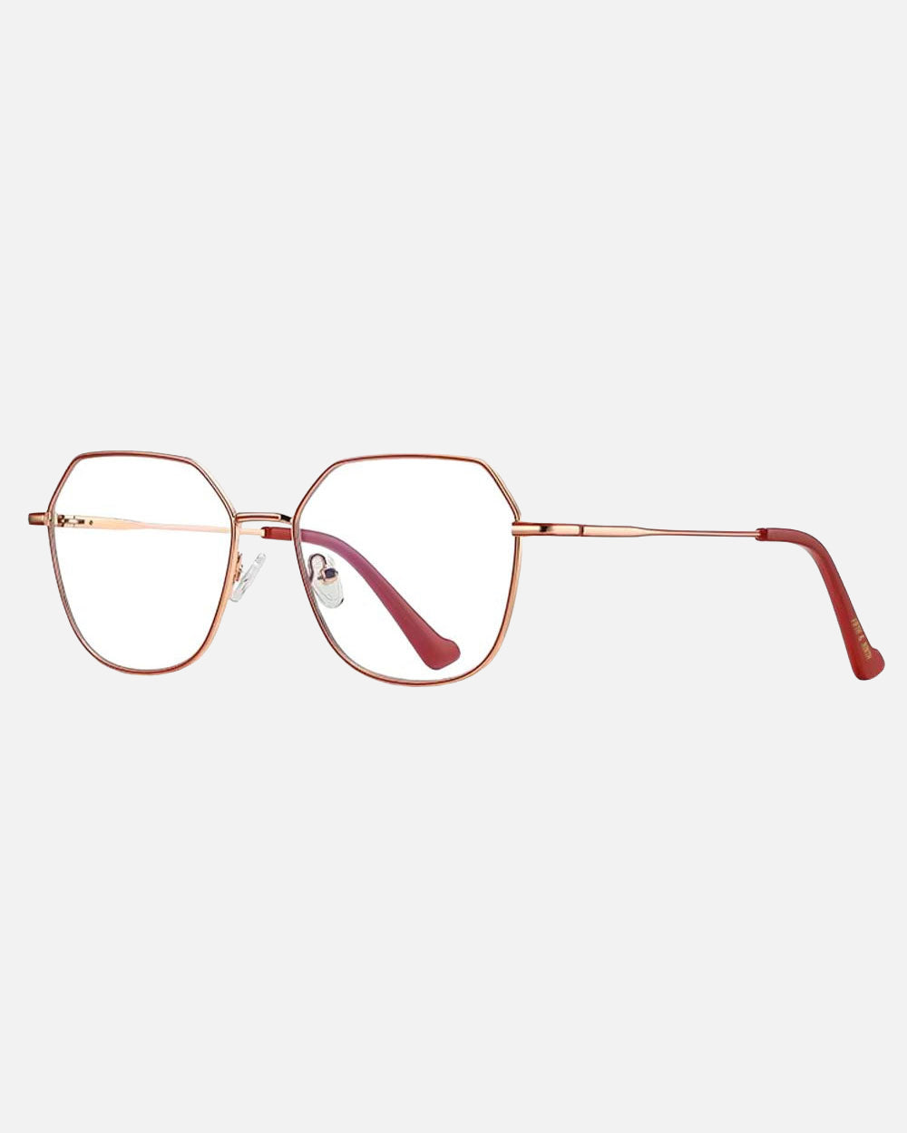 Introducing Cora blue light glasses, a chic metal-frame cat-eye with a playful pop of color. The clear rubberized ear tips provide added comfort while featuring bold accents for a fun twist on a classic design. Perfect for those who want both style and comfort in one sleek accessory.