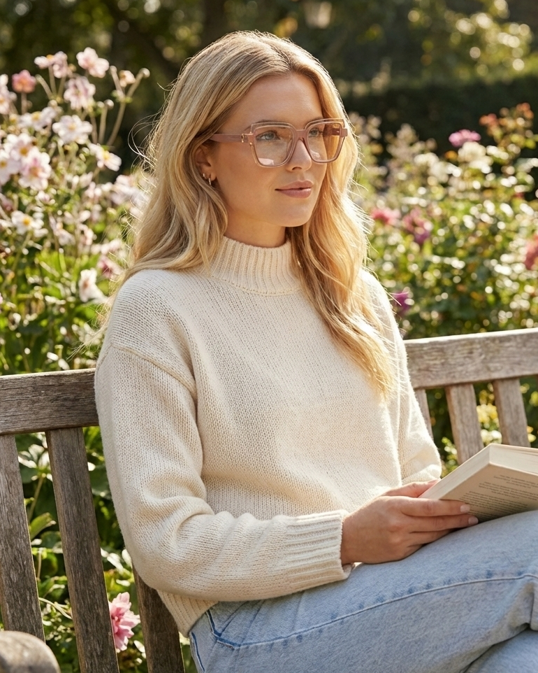 Kitt blue light glasses stand out with their oversized square shape and subtle two-tone color play, giving a modern twist to a classic silhouette. Sleek yet expressive, Kitt brings polished energy to both workday screens and off-duty wear.