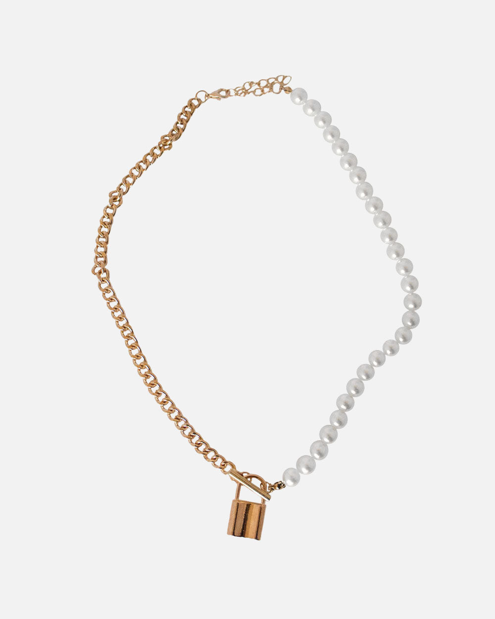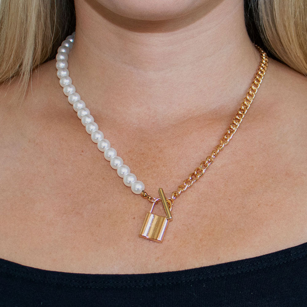 The Leah necklace locks in your look. This statement necklace combines bold contrast with a half-pearl, half-chain design and a chunky gold padlock pendant. Finished with a front toggle detail, it’s the perfect edgy piece to elevate your everyday rotation.