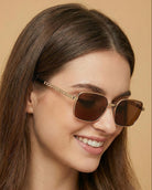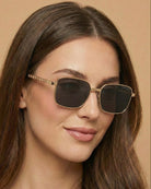 Romy polarized sunglasses bring modern elegance with their sleek rectangular frame and polished metal finish. Featuring chain-link detailing along the temples, this style blends subtle edge with high-shine sophistication for a statement look that’s still versatile.