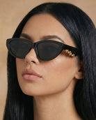 Brynn Polarized Sunglasses are a modern take on the classic cat-eye frame. With a contemporary scroll-like gold embellishment on each arm, these sunglasses are a statement piece. Available in black with orange lenses, classic black, and chic torte.